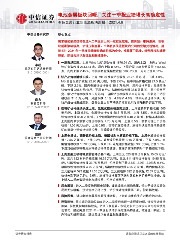【中信证券】【20210406】20210406-中信证券-有色金属行业新能源板块周报:电池金属板块回暖,关注一季报业绩增长高确定性-16页