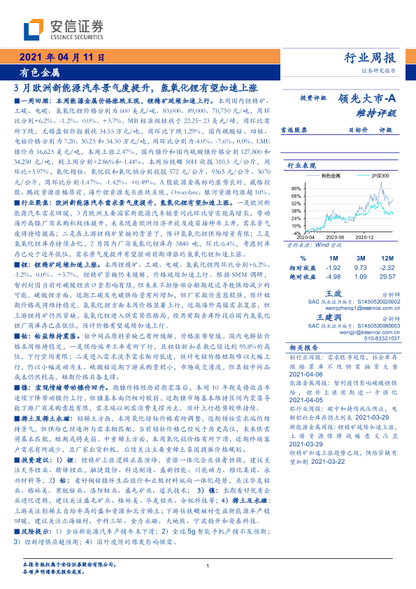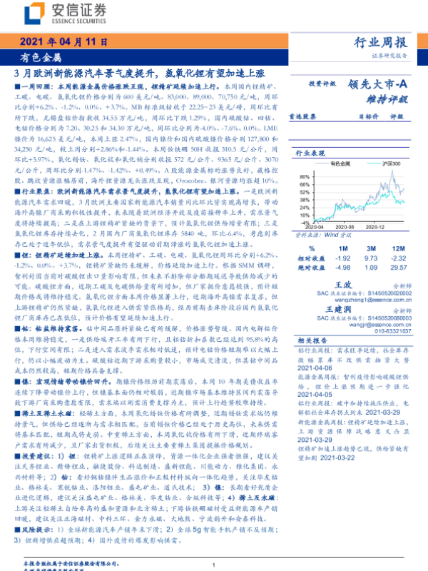 【安信证券】【20210411】20210411-安信证券-有色金属行业周报:3月欧洲新能源汽车景气度提升,氢氧化锂有望加速上涨-26页