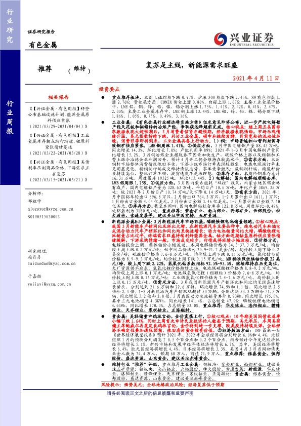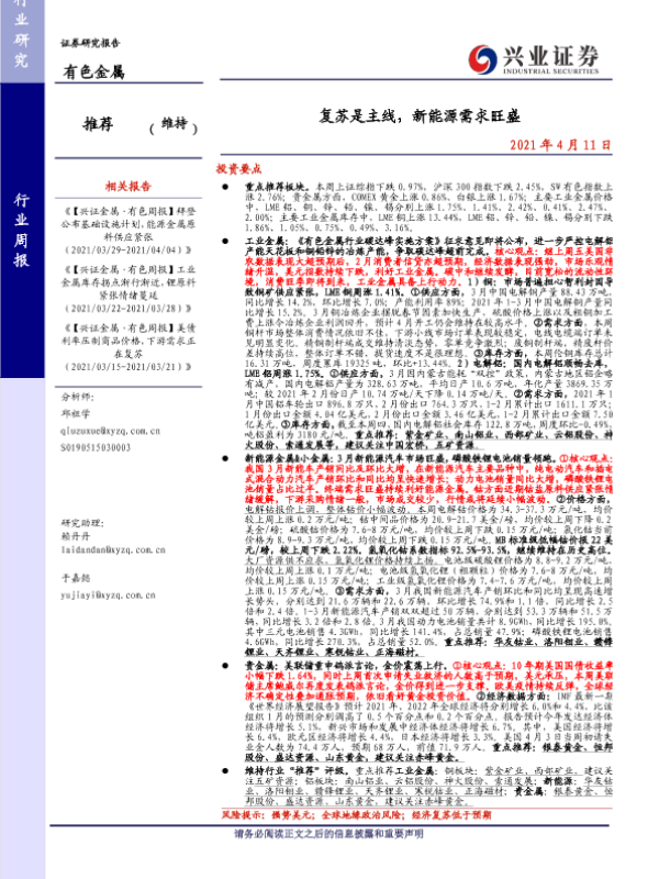 【兴业证券】【20210411】20210411-兴业证券-有色金属行业周报:复苏是主线,新能源需求旺盛-22页