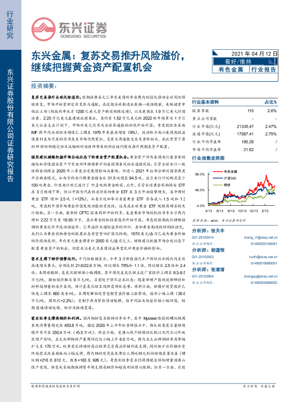 【东兴证券】【20210412】东兴金属:复苏交易推升风险溢价,继续把握黄金资产配置机会-26页