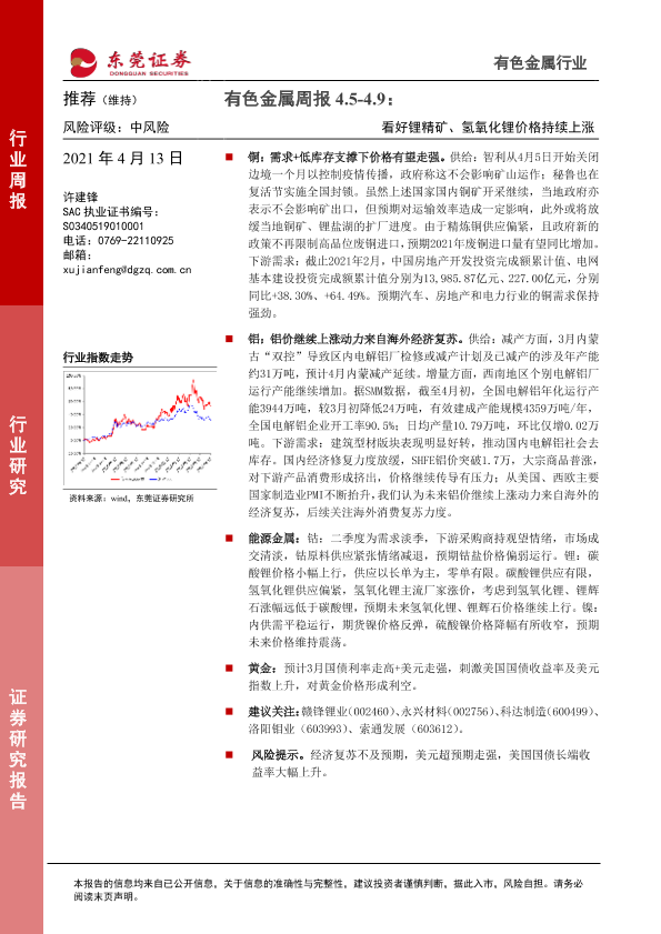 【东莞证券】【20210413】20210413-东莞证券-有色金属周报:看好锂精矿、氢氧化锂价格持续上涨-28页