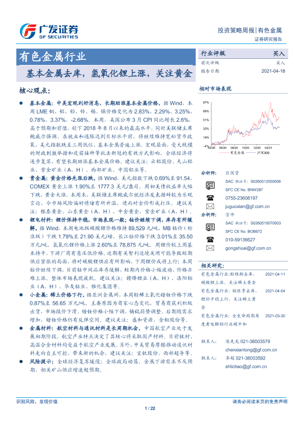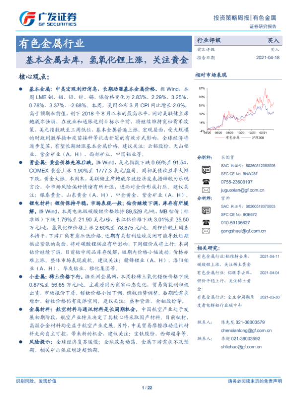 【广发证券】【20210418】有色金属行业:基本金属去库,氢氧化锂上涨,关注黄金-22页