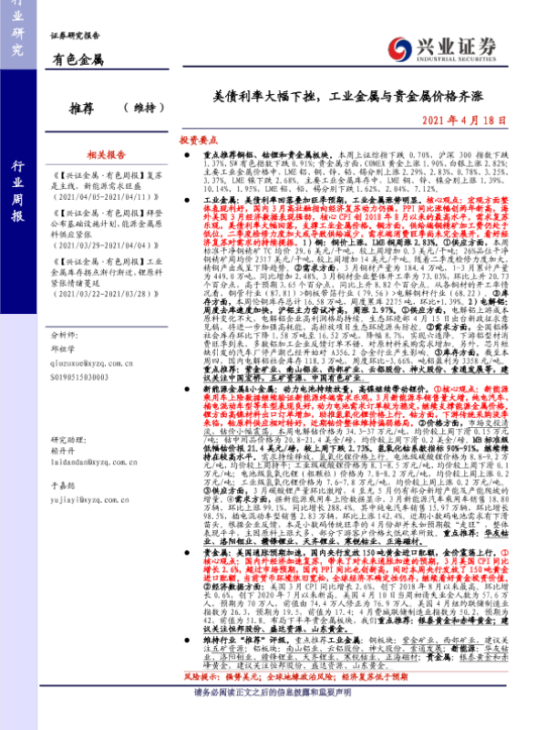 【兴业证券】【20210418】20210418-兴业证券-有色金属行业周报:美债利率大幅下挫,工业金属与贵金属价格齐涨-22页