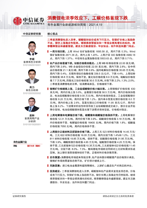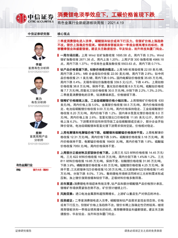 【中信证券】【20210419】20210419-中信证券-有色金属行业新能源板块周报:消费锂电淡季效应下,工碳价格首现下跌-16页
