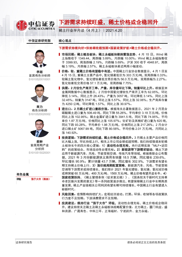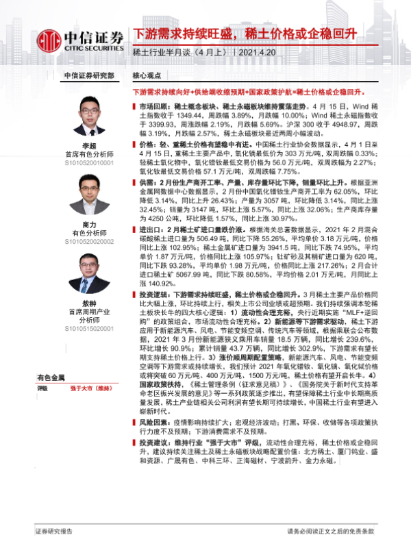 【中信证券】【20210420】稀土行业半月谈(4月上):下游需求持续旺盛,稀土价格或企稳回升-35页