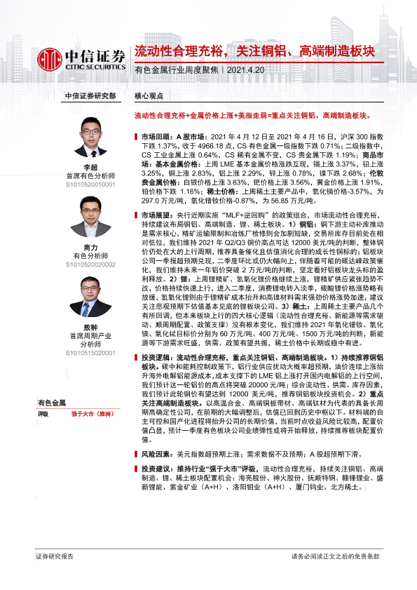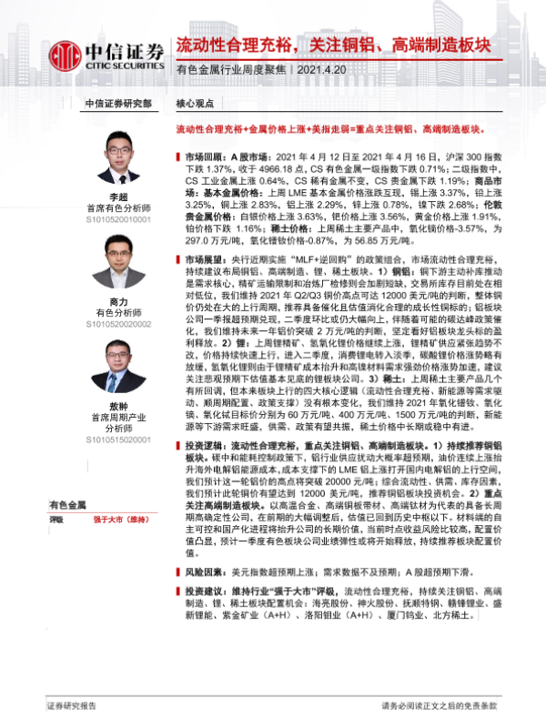 【中信证券】【20210420】20210420-中信证券-有色金属行业周度聚焦:流动性合理充裕,关注铜铝、高端制造板块-18页
