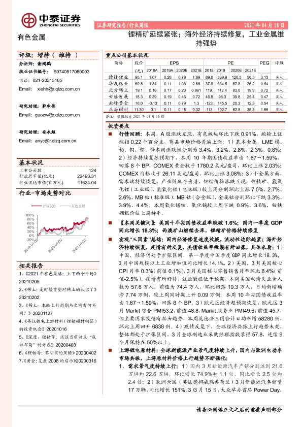 【中泰证券】【20210418】20210418-中泰证券-有色金属行业周报:锂精矿延续紧张;海外经济持续修复,工业金属维持强势-40页
