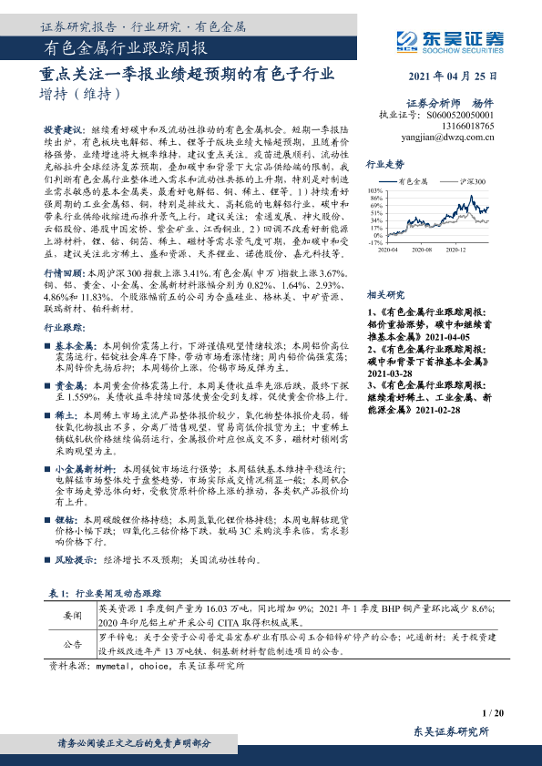 【东吴证券】【20210425】20210425-东吴证券-有色金属行业跟踪周报:重点关注一季报业绩超预期的有色子行业-20页