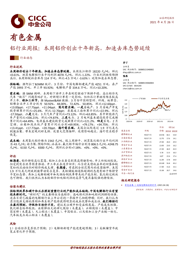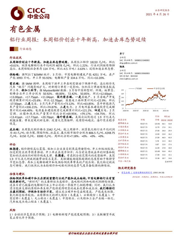 【中金公司】【20210426】铝行业周报:本周铝价创出十年新高,加速去库态势延续-23页