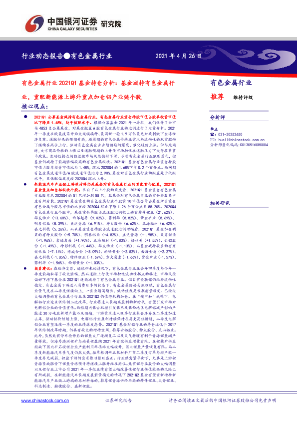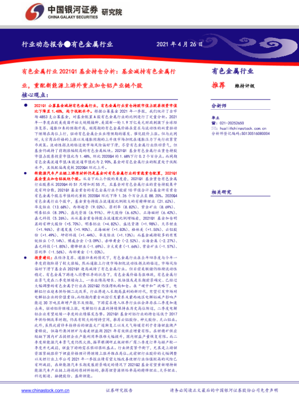 【银河证券】【20210426】有色金属行业2021Q1基金持仓分析:基金减持有色金属行业,重配新能源上游外重点加仓铝产业链个股-12页
