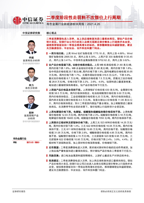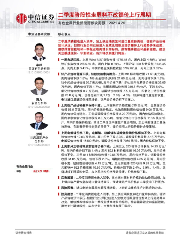 【中信证券】【20210426】20210426-中信证券-有色金属行业新能源板块周报:二季度阶段性走弱料不改锂价上行周期-16页