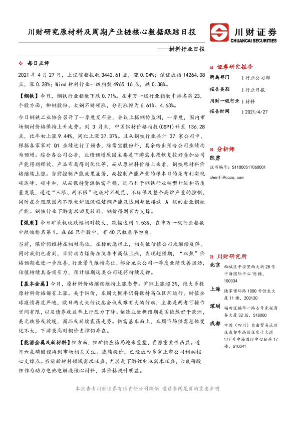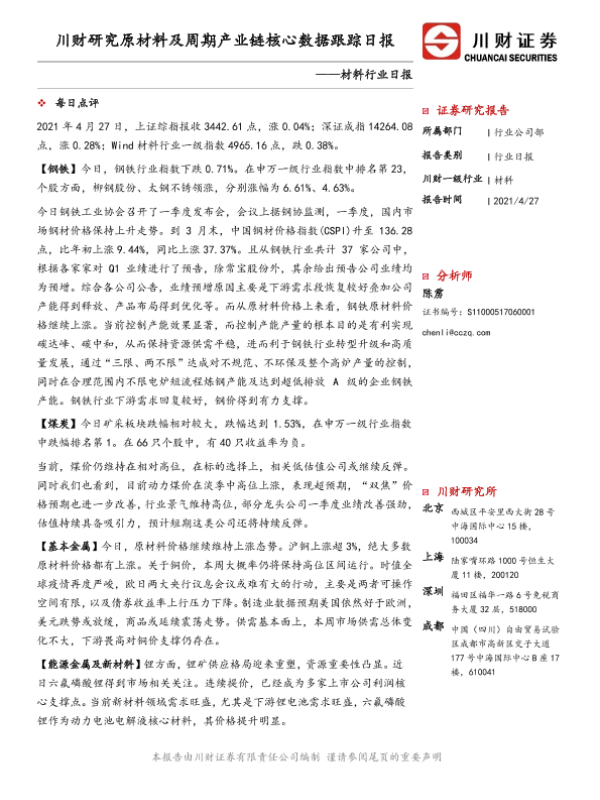【川财证券】【20210427】材料行业日报:川财研究原材料及周期产业链核心数据跟踪日报-4页