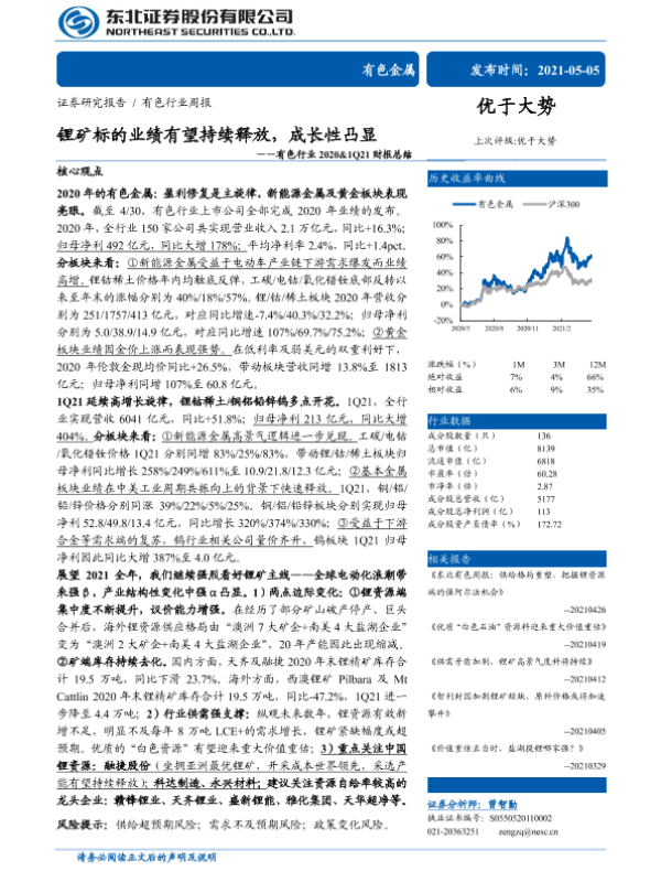 【东北证券】【20210505】锂矿标的业绩有望持续释放,成长性凸显——有色行业2020&1Q21财报总结-23页