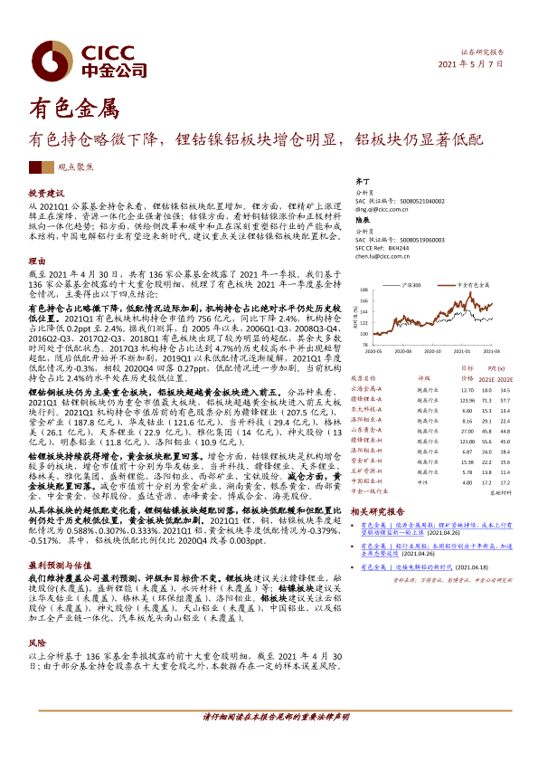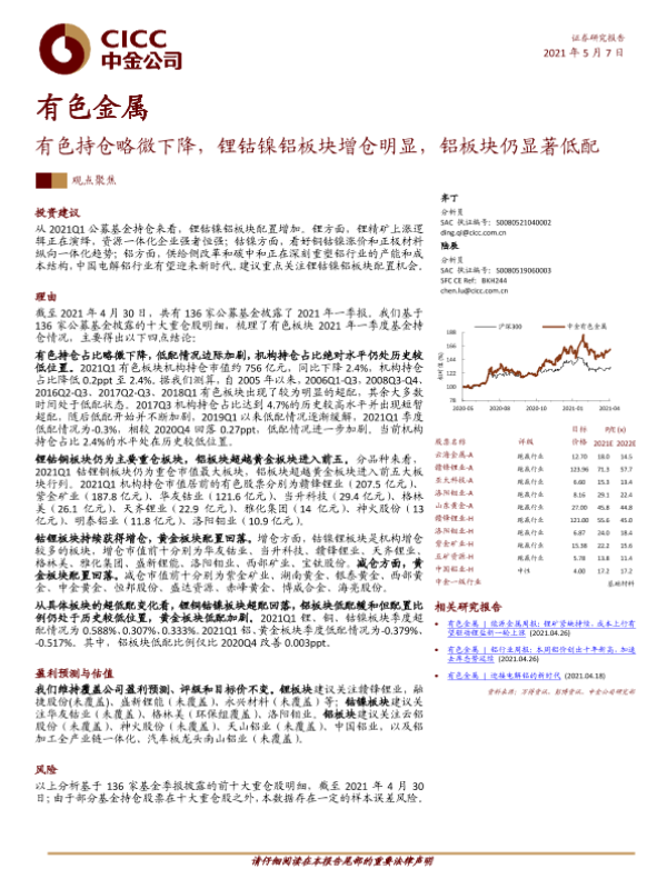 【中金公司】【20210507】20210507-中金公司-有色金属行业:有色持仓略微下降,锂钴镍铝板块增仓明显,铝板块仍显著低配-11页