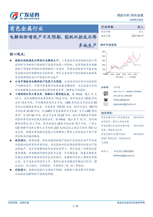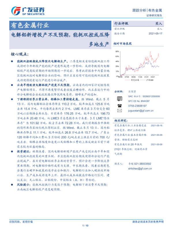 【广发证券】【20210517】20210517-广发证券-有色金属行业跟踪分析:电解铝新增投产不及预期,能耗双控或压降多地生产-10页