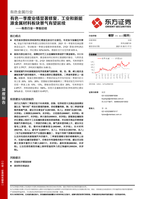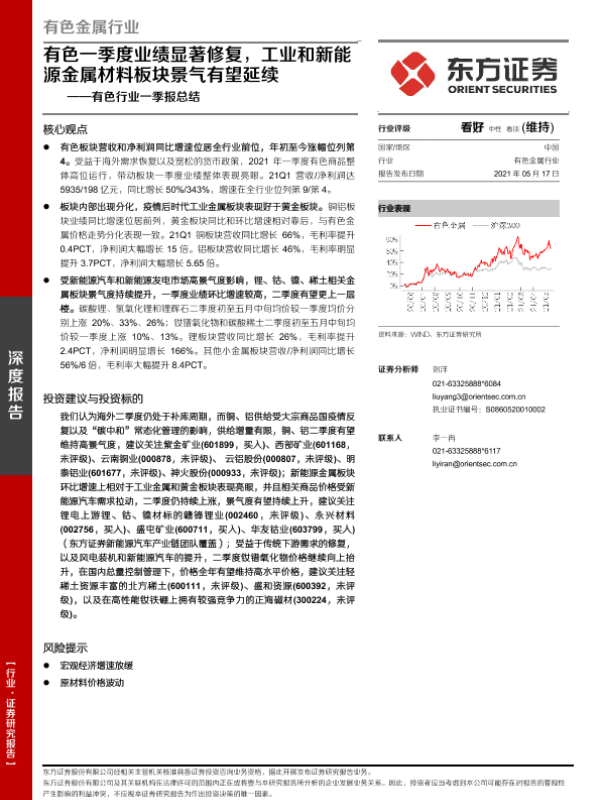 【东方证券】【20210517】有色一季度业绩显著修复,工业和新能源金属材料板块景气有望延续-29页