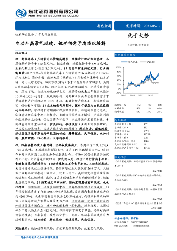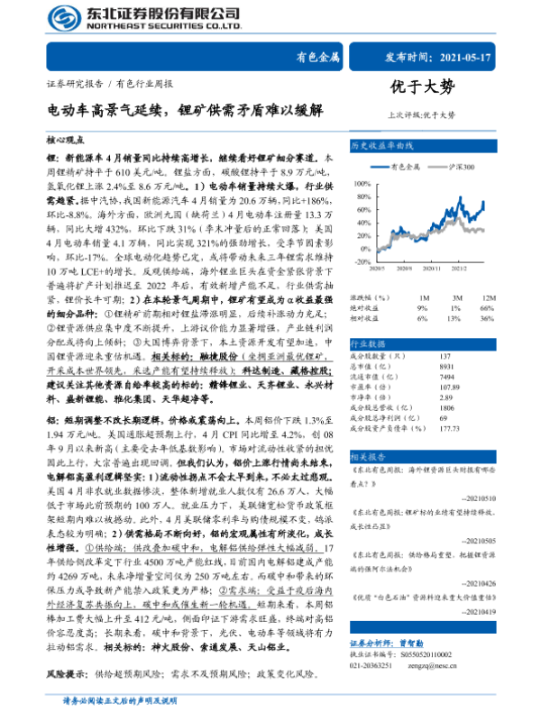 【东北证券】【20210517】20210517-东北证券-有色行业周报:电动车高景气延续,锂矿供需矛盾难以缓解-16页