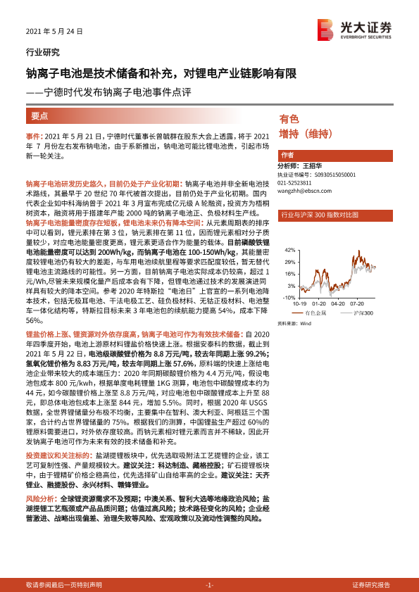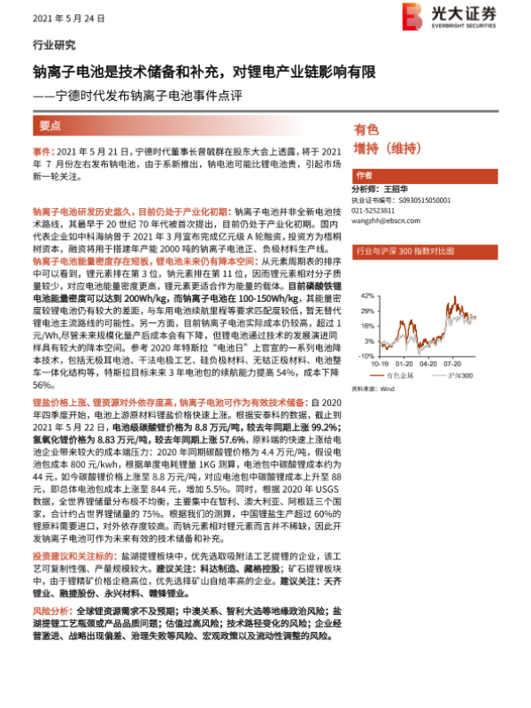 【光大证券】【20210524】宁德时代发布钠离子电池事件点评:钠离子电池是技术储备和补充,对锂电产业链影响有限-3页