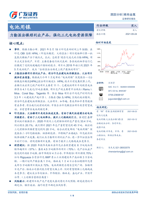 【广发证券】【20210524】电池用镍跟踪分析:力勤湿法镍顺利出产品,强化三元电池资源保障-8页
