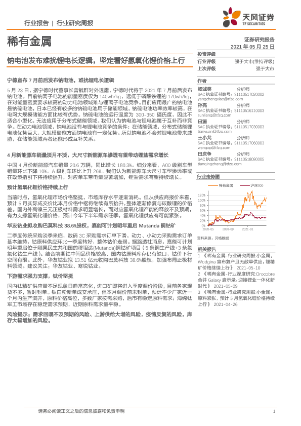 【天风证券】【20210525】20210525-天风证券-稀有金属行业研究周报:钠电池发布难扰锂电长逻辑,坚定看好氢氧化锂价格上行-16页
