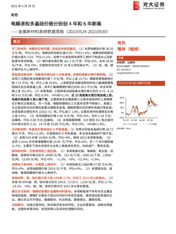 【光大证券】【20210529】20210529-光大证券-金属新材料高频数据周报:电解液和多晶硅价格分别创4年和6年新高-26页