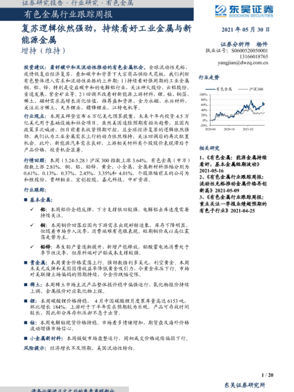 【东吴证券】【20210530】20210530-东吴证券-有色金属行业跟踪周报:耗复苏逻辑依然强劲,持续看好工业金属与新能源金属-20页