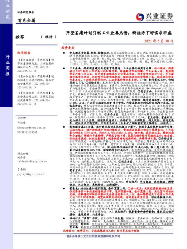【兴业证券】【20210530】20210530-兴业证券-有色金属行业周报:拜登基建计划引燃工业金属热情,新能源下游需求旺盛-24页