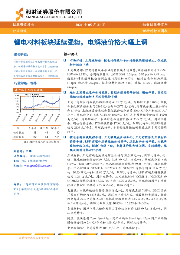 【湘财证券】【20210531】20210531-湘财证券-新材料行业周报:锂电材料板块延续强势,电解液价格大幅上调-12页
