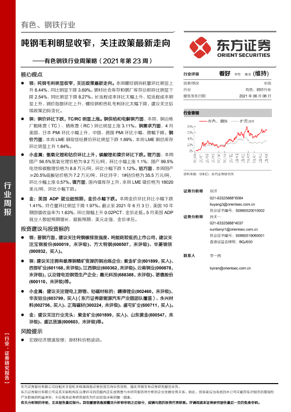 【东方证券】【20210606】20210606-东方证券-有色钢铁行业周策略(2021年第23周):吨钢毛利明显收窄,关注政策最新走向-26页