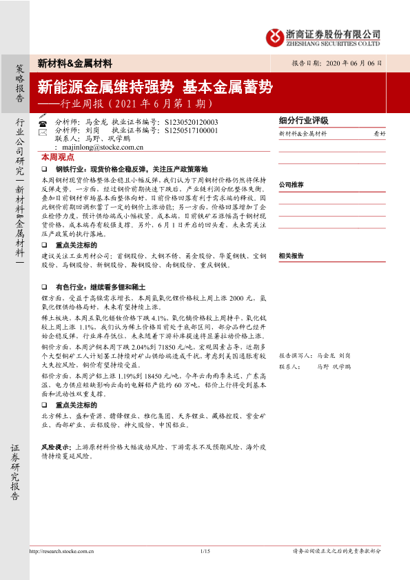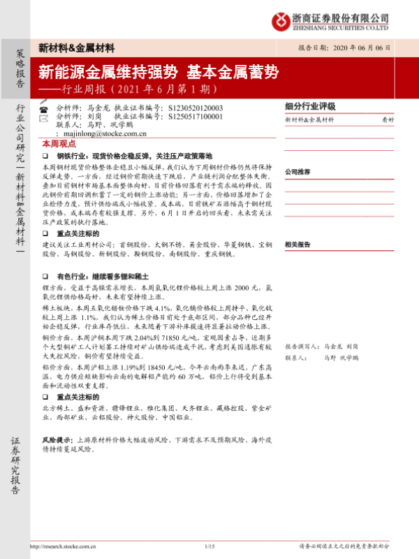 【浙商证券】【20210606】20210606-浙商证券-新材料&金属材料行业周报:新能源金属维持强势 基本金属蓄势-15页