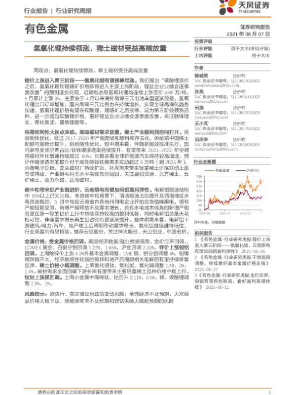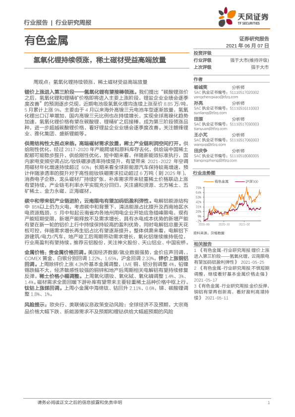 【天风证券】【20210607】20210607-天风证券-有色金属行业研究周报:氢氧化锂持续领涨,稀土磁材受益高端放量-12页