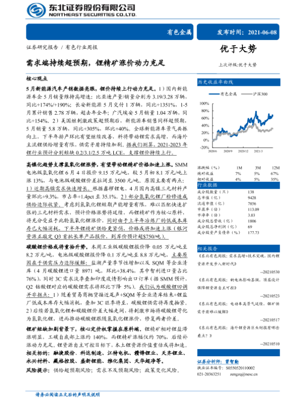 【东北证券】【20210608】20210608-东北证券-有色行业周报:需求端持续超预期,锂精矿涨价动力充足-16页