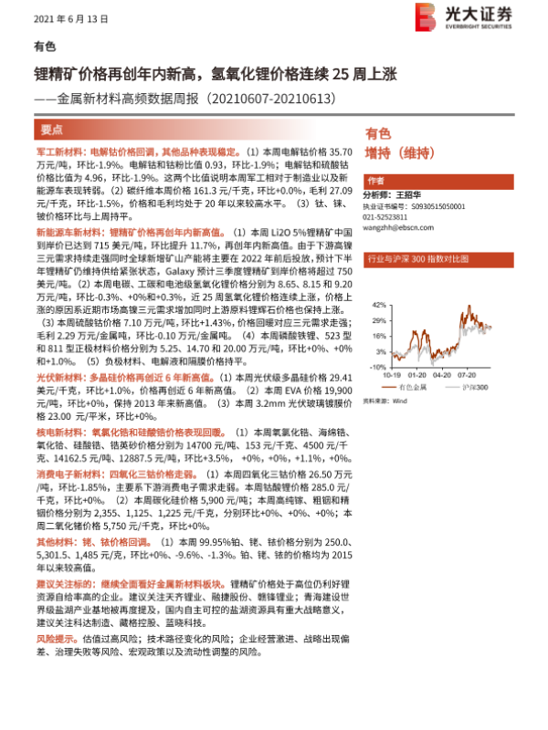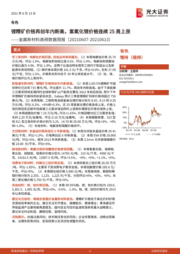 【光大证券】【20210613】20210613-光大证券-金属新材料高频数据周报:锂精矿价格再创年内新高,氢氧化锂价格连续25周上涨-26页