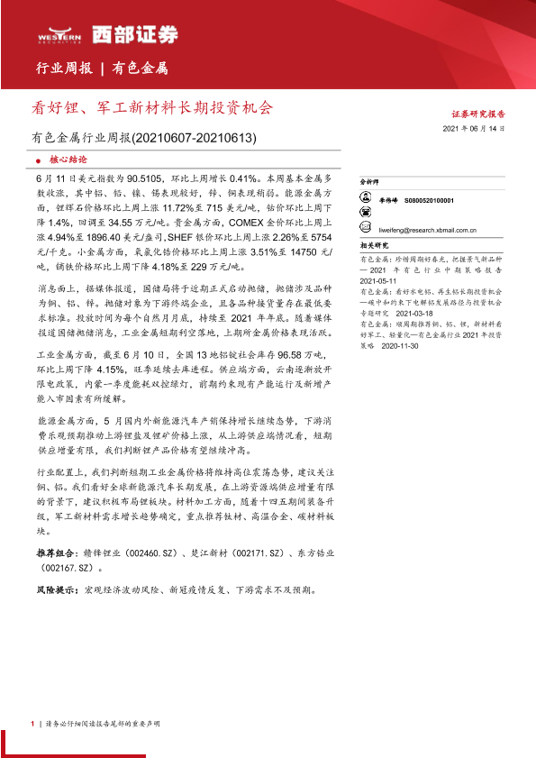 【西部证券】【20210614】20210614-西部证券-有色金属行业周报:看好锂、军工新材料长期投资机会-13页