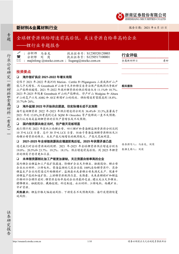 【浙商证券】【20210615】全球锂资源供给增速前高后低,关注资源自给率高的企业-10页