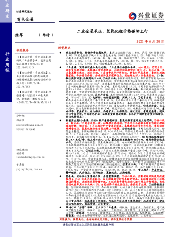 【兴业证券】【20210620】20210620-兴业证券-有色金属行业周报:工业金属承压,氢氧化锂价格强势上行-23页