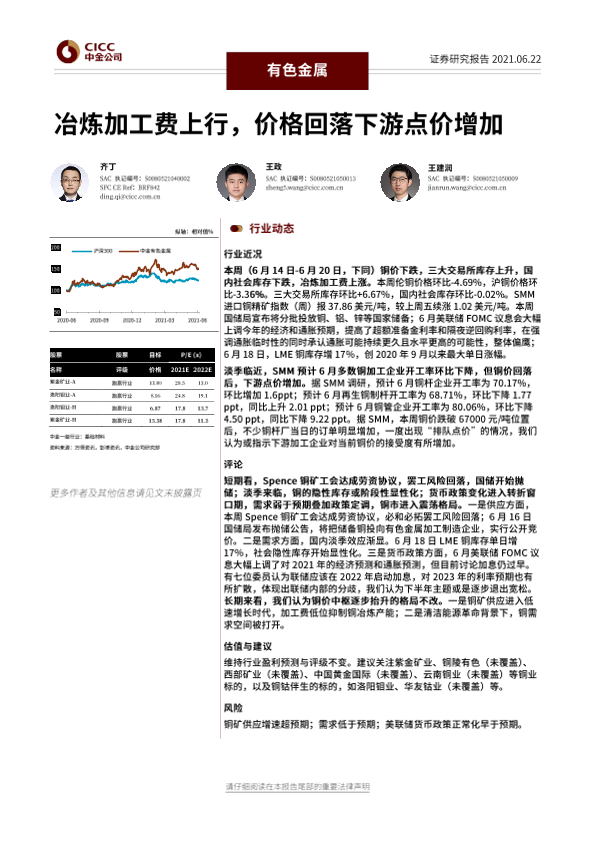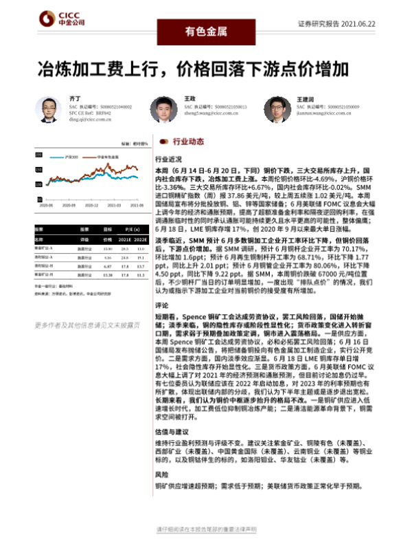 【中金公司】【20210622】20210622-中金公司-有色金属行业:冶炼加工费上行,价格回落下游点价增加-22页