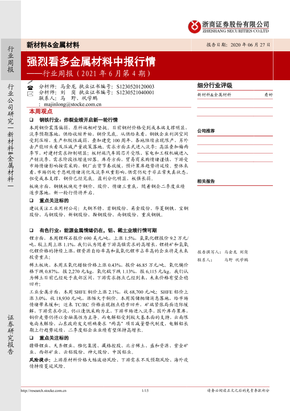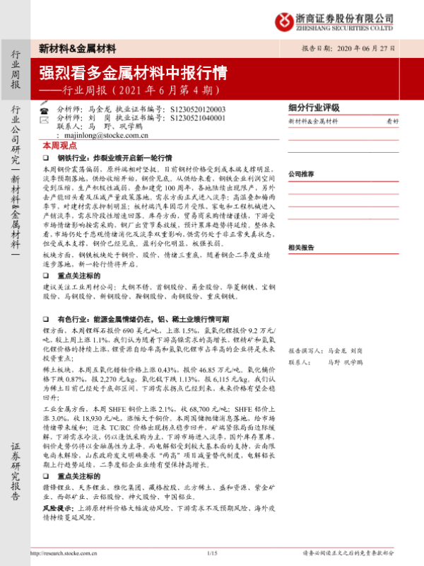 【浙商证券】【20210627】20210627-浙商证券-新材料&金属材料行业周报(2021年6月第4期):强烈看多金属材料中报行情-15页