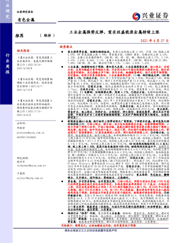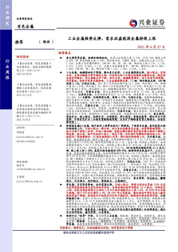 【兴业证券】【20210627】有色金属行业:工业金属强势反弹,需求旺盛能源金属持续上涨-22页