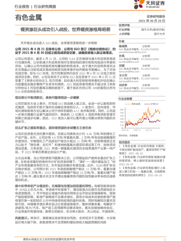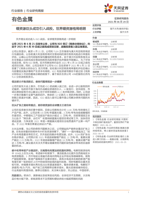 【天风证券】【20210629】20210629-天风证券-有色金属行业研究周报:锂资源巨头成功引入战投,世界锂资源格局明朗-14页