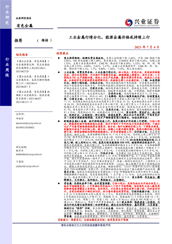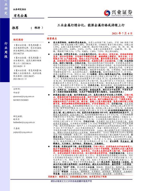 【兴业证券】【20210704】20210704-兴业证券-有色金属行业周报:工业金属行情分化,能源金属价格或持续上行-23页