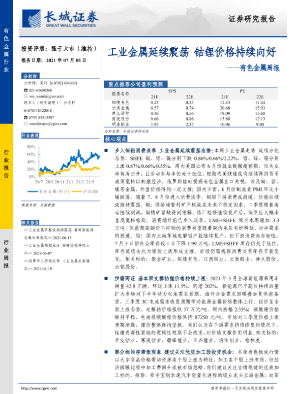 【长城证券】【20210705】20210705-长城证券-有色金属周报:工业金属延续震荡 钴锂价格持续向好-12页