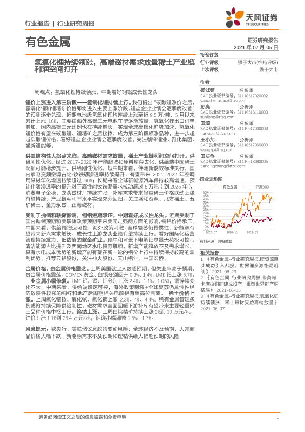 【天风证券】【20210705】20210705-天风证券-有色金属行业研究周报:氢氧化锂持续领涨,高端磁材需求放量稀土产业链利润空间打开-10页