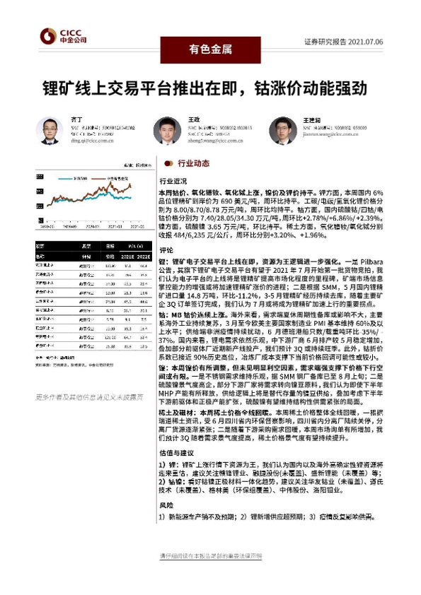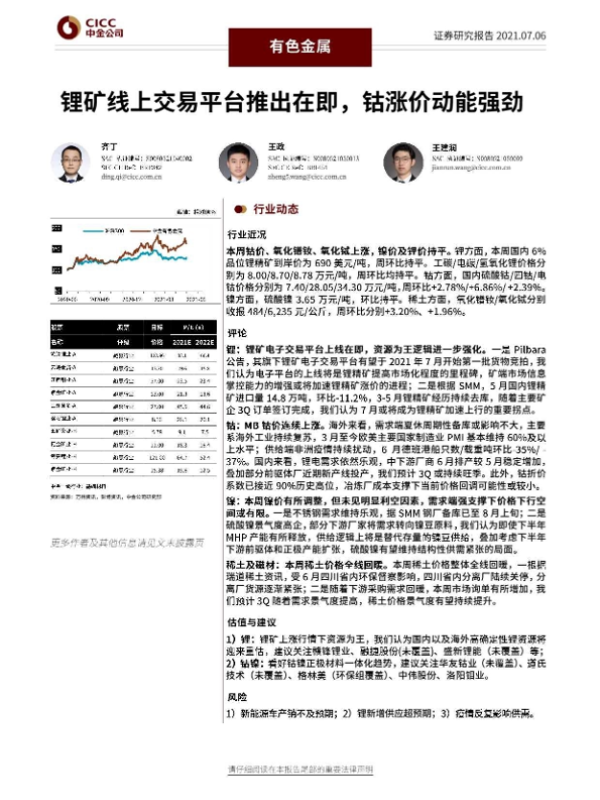 【中金公司】【20210706】20210706-中金公司-有色金属行业动态:锂矿线上交易平台推出在即,钴涨价动能强劲-29页