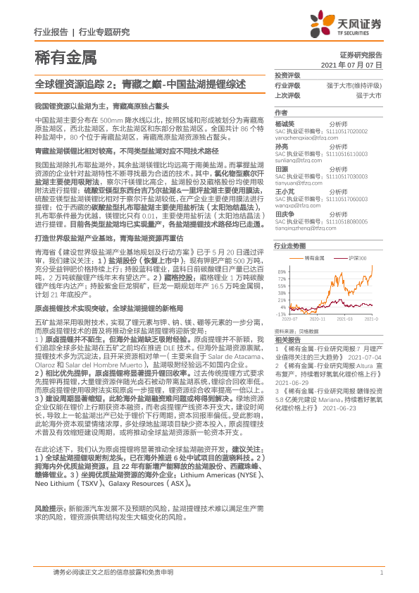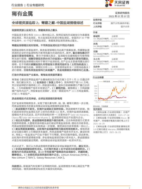 【天风证券】【20210707】稀有金属行业:全球锂资源追踪2:青藏之巅-中国盐湖提锂综述-12页
