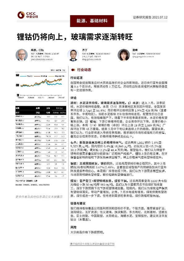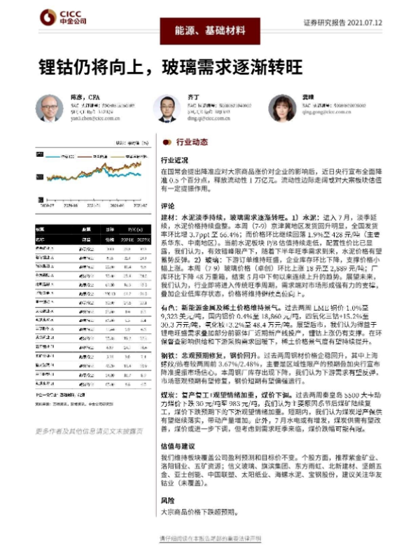 【中金公司】【20210712】能源、基础材料:锂钴仍将向上,玻璃需求逐渐转旺-24页
