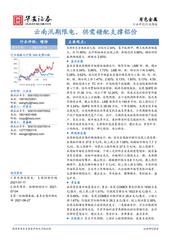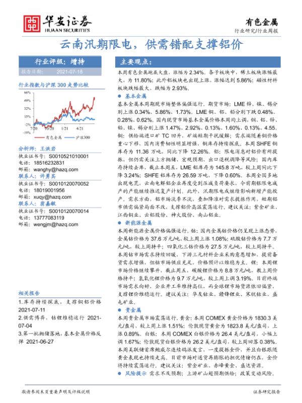 【华安证券】【20210718】20210718-华安证券-有色金属行业周报:云南汛期限电,供需错配支撑铝价-13页