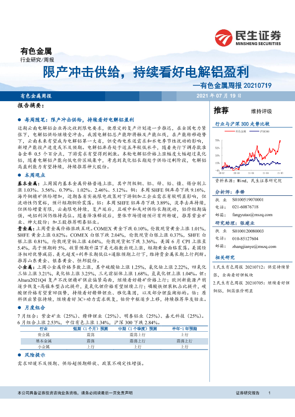 【民生证券】【20210719】20210719-民生证券-有色金属周报:限产冲击供给,持续看好电解铝盈利-19页