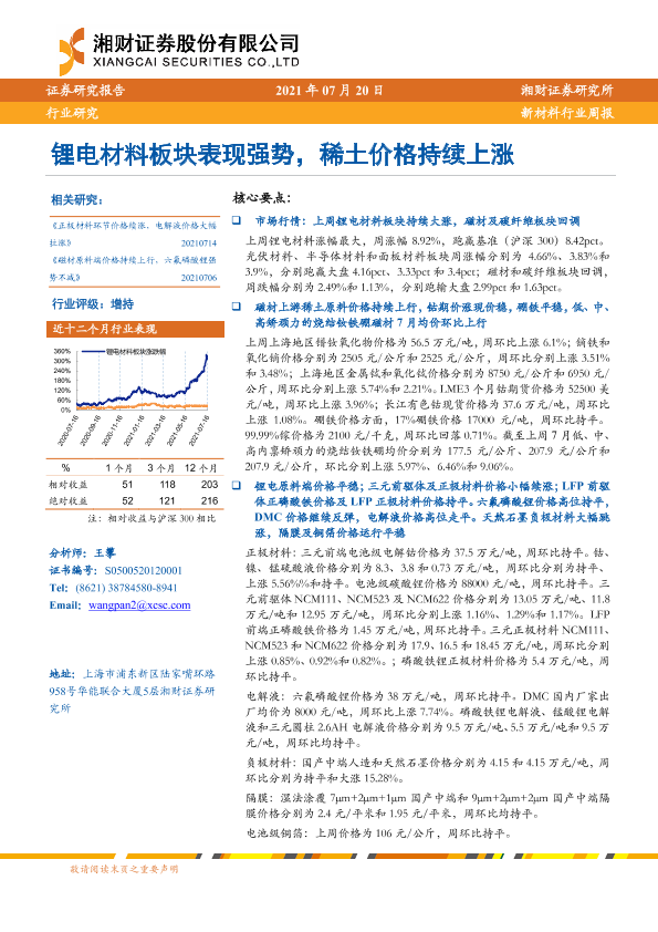 【湘财证券】【20210720】20210720-湘财证券-新材料行业周报:锂电材料板块表现强势,稀土价格持续上涨-13页