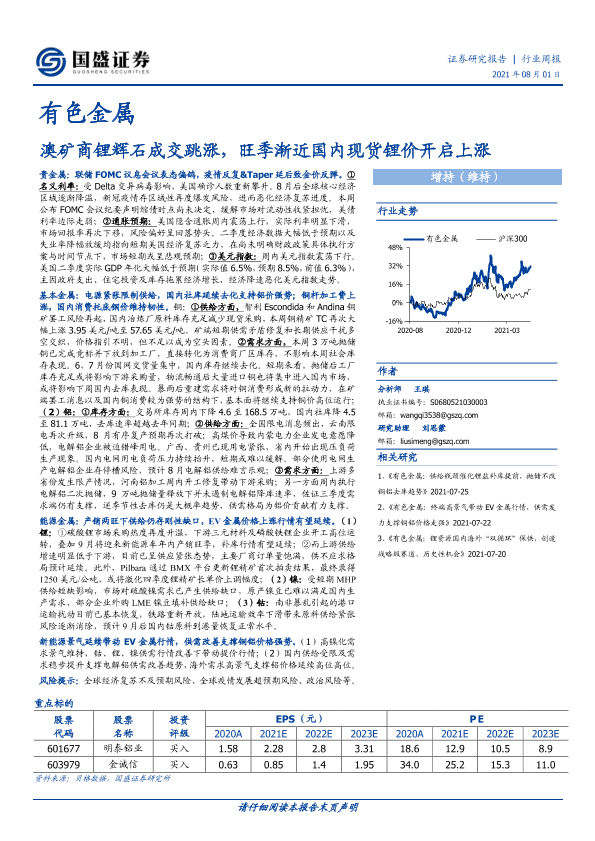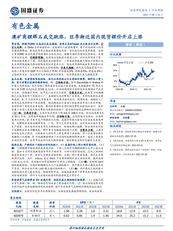 【国盛证券】【20210801】20210801-国盛证券-有色金属行业周报:澳矿商锂辉石成交跳涨,旺季渐近国内现货锂价开启上涨-21页